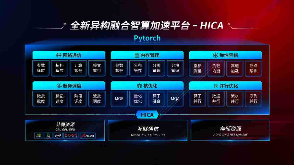 通过自研的服务层、、、中间适配层、、、以及调度编排算法,,,采用数据并行、、模型并行等多种并行方式,,,把并行计算任务进行有效的分解,,使其分别由相应的软件栈和算力资源来承接。。。当GPU资源变化,,,,HICA可以实时动态调度计算子任务并调整模型拓扑和架构,,,以充分聚合各种算力资源。。。