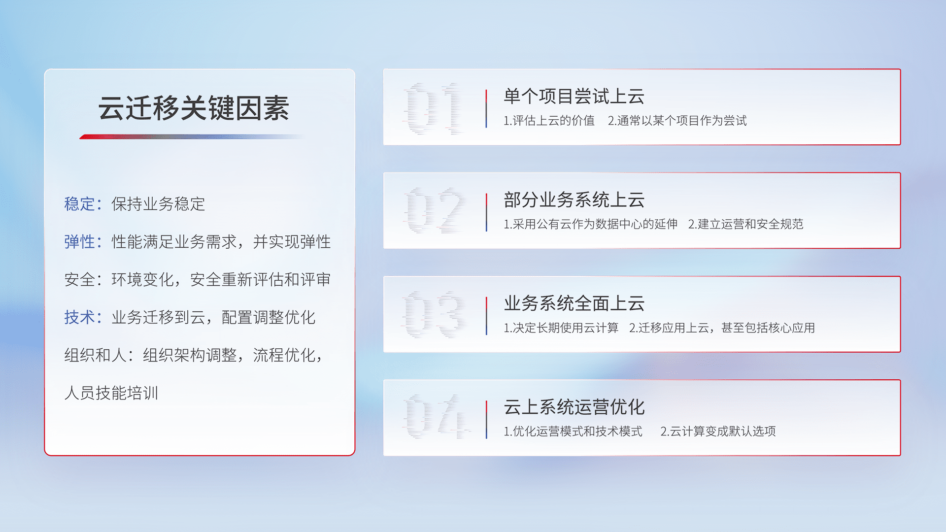 结合实际业务,,从规划设计、、、云平台选型、、、、云原生改造、、、、数据迁移、、集成交付,,迁移全过程为客户识别最佳上云路径,,,,做好风险识别管理,,,,设计网络架构、、、、身份权限、、安全审计合规、、、操作审计、、、日志审计、、、监控告警策略、、多站点容灾设计等,,,,对云上基础设施进行整体规划,,,,提升IT治理水平,,,以满足弹性、、、、高可用、、、高性能的需求。。。